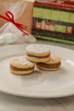Caja que incluye 40 tapitas de alfajores para armar 20 alfajores y un jar de manjar a elegir entre: manjar de pistacho, manjar de coco o manjar de olla. Además, la caja contiene una espátula para servir.