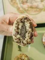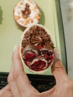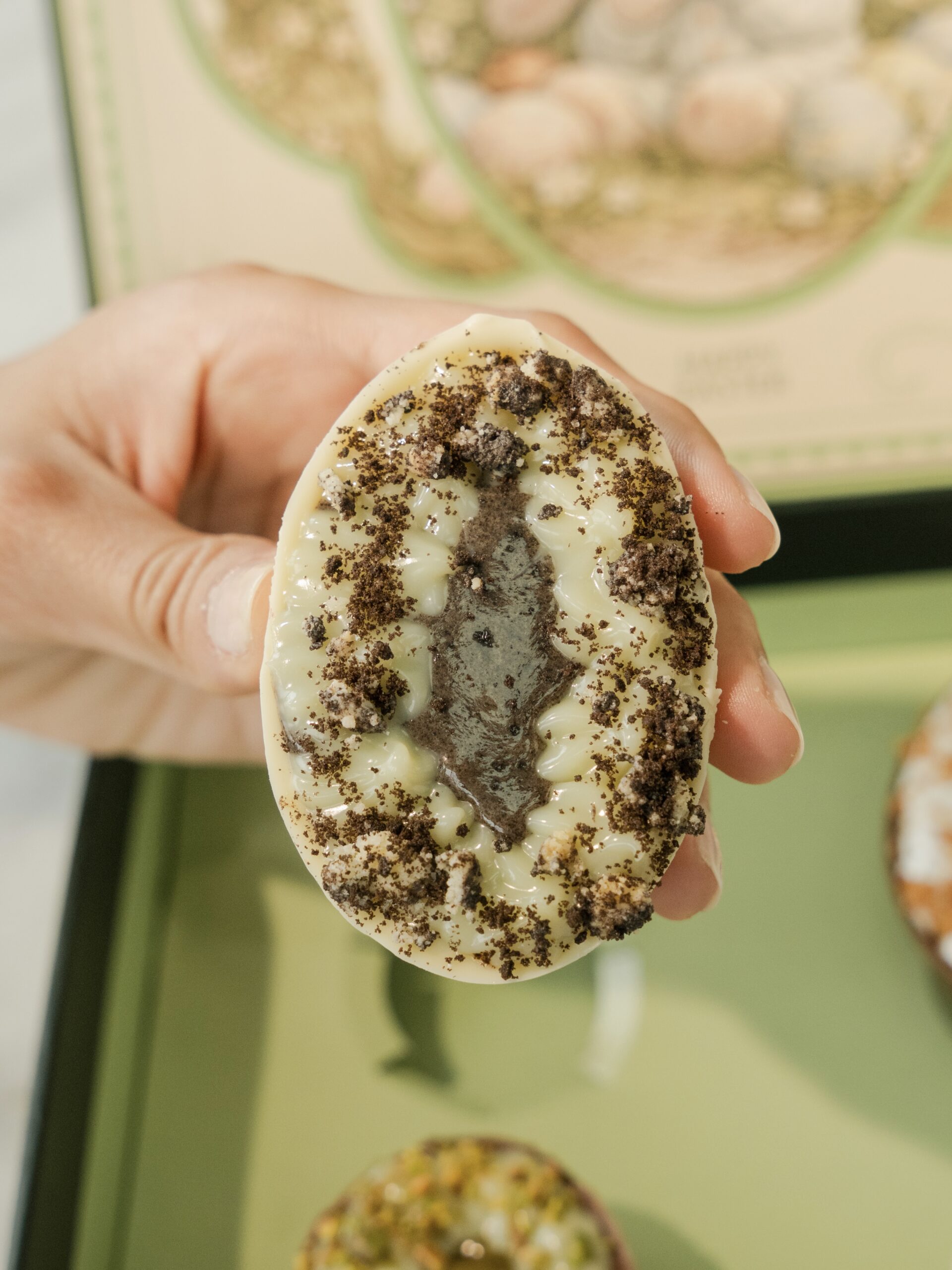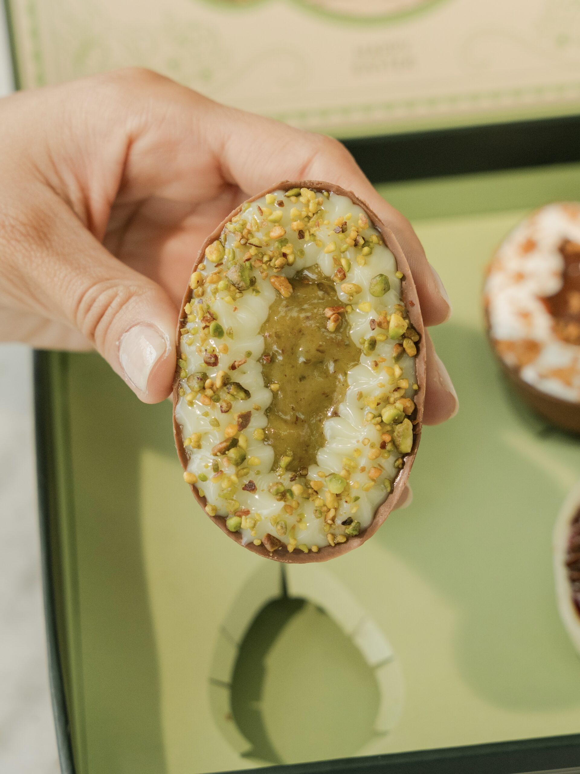 Pistacho & Chocolate: Cobertura de chocolate rellena de bizcocho de chocolate, salsa de pistacho, nuestro nuevo brigadeiro y pistacho triturado.