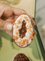 S’more: Cobertura de chocolate rellena de pie de chocolate artesanal, crumble de lengua de gato y terminado con marshmallow flambeado.