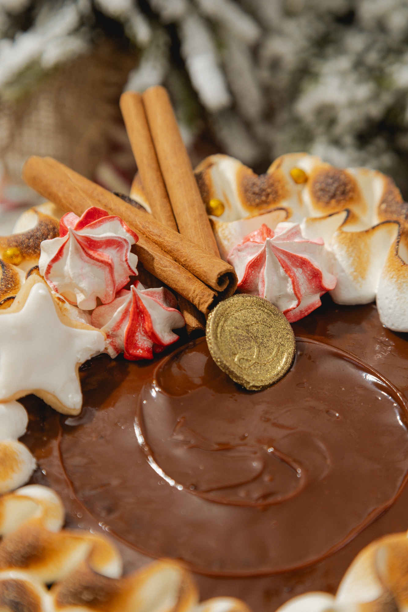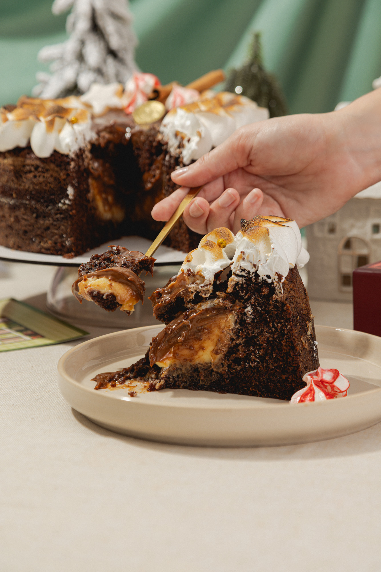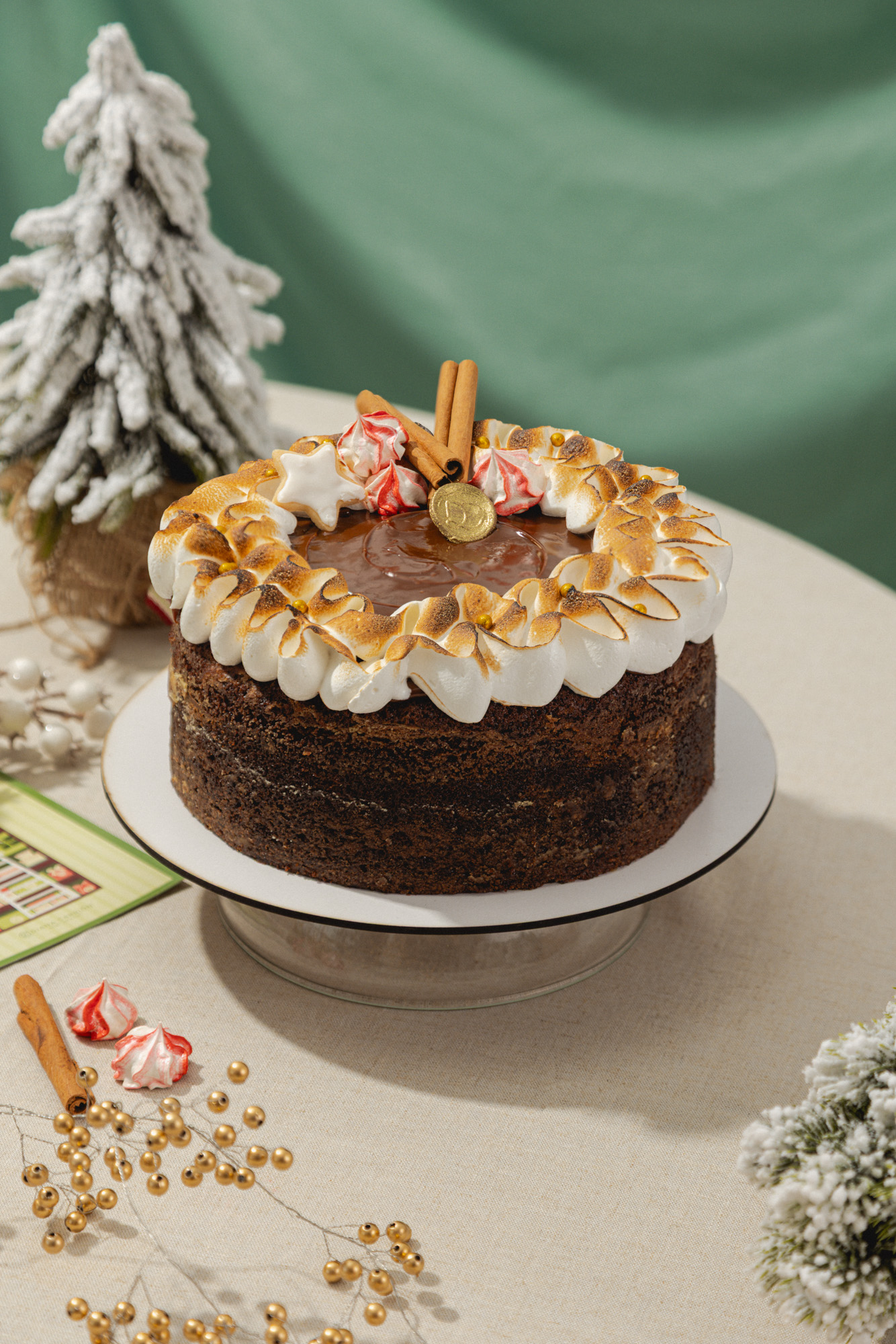 Torta de chocolate húmeda con relleno de fudge de olla con especias navideñas, crema de Nido y decorada con merengue flambeado.