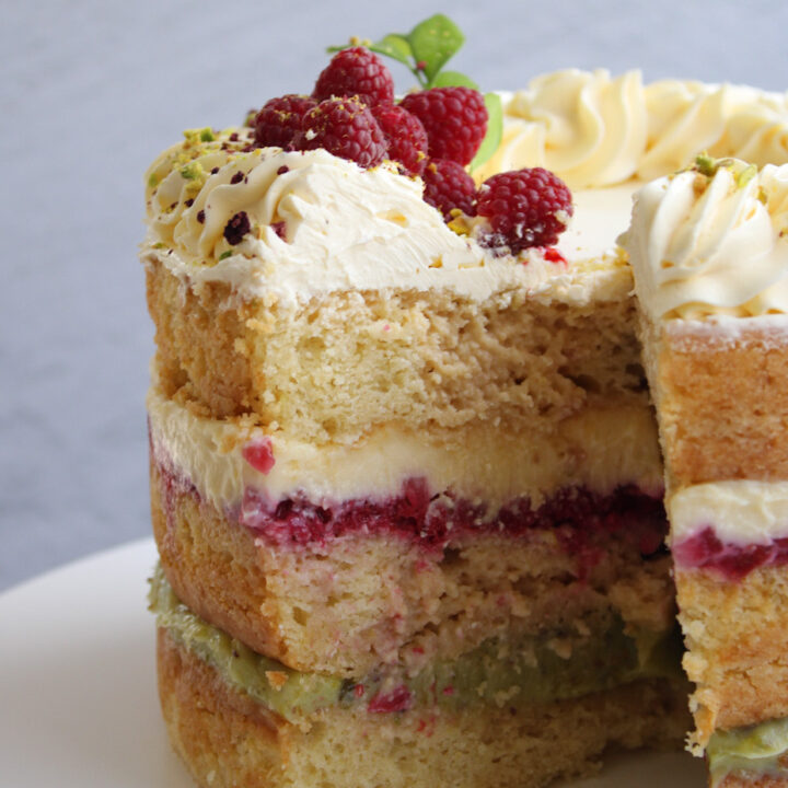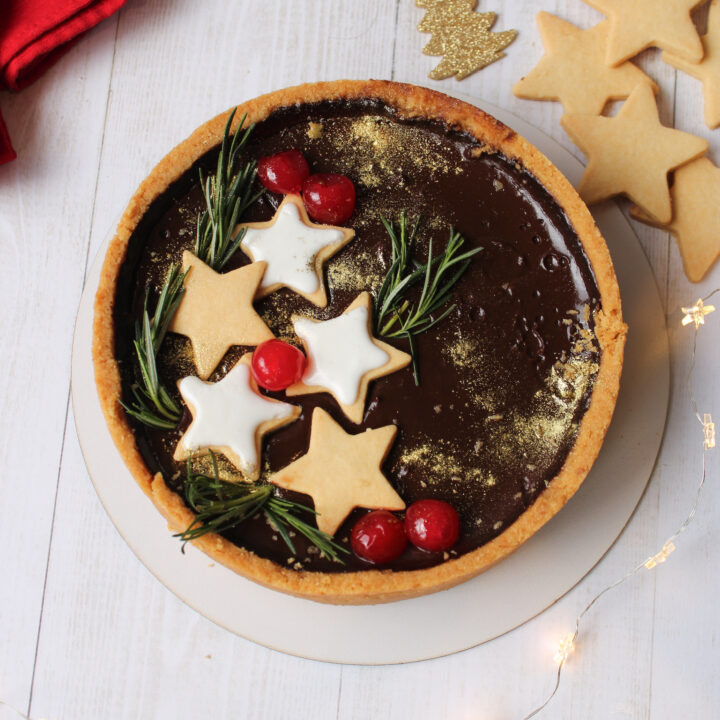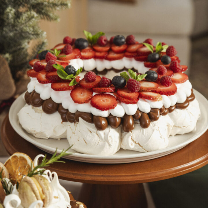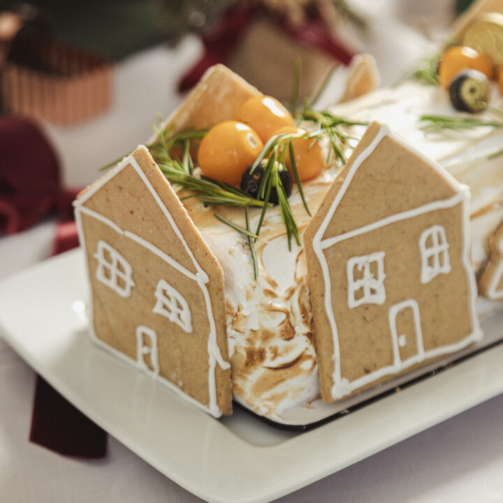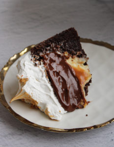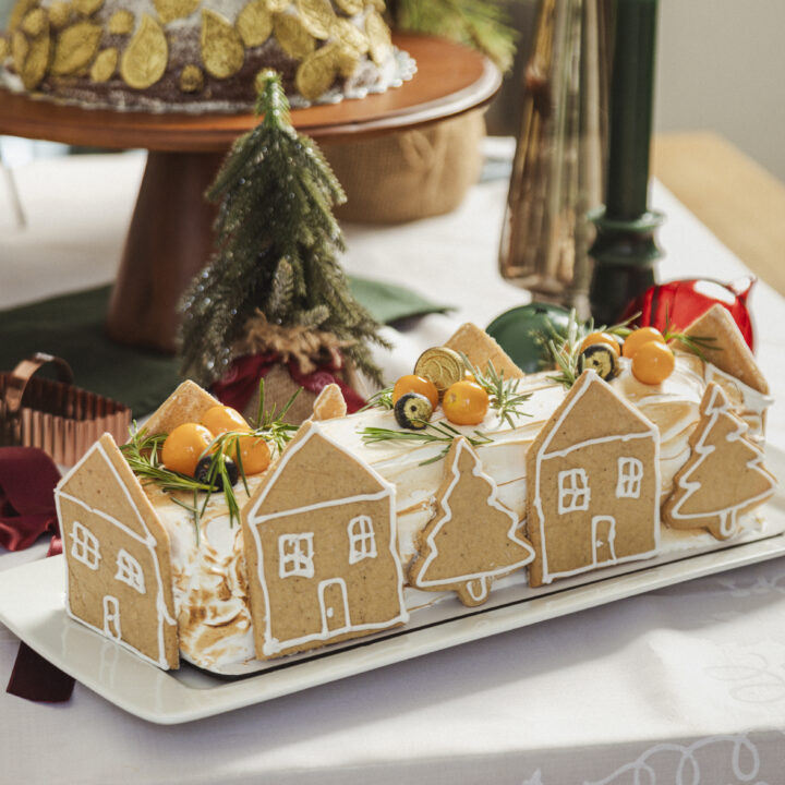 Torta de chocolate húmeda con relleno de fudge de olla con especias navideñas, crema de Nido y decorada con merengue flambeado.