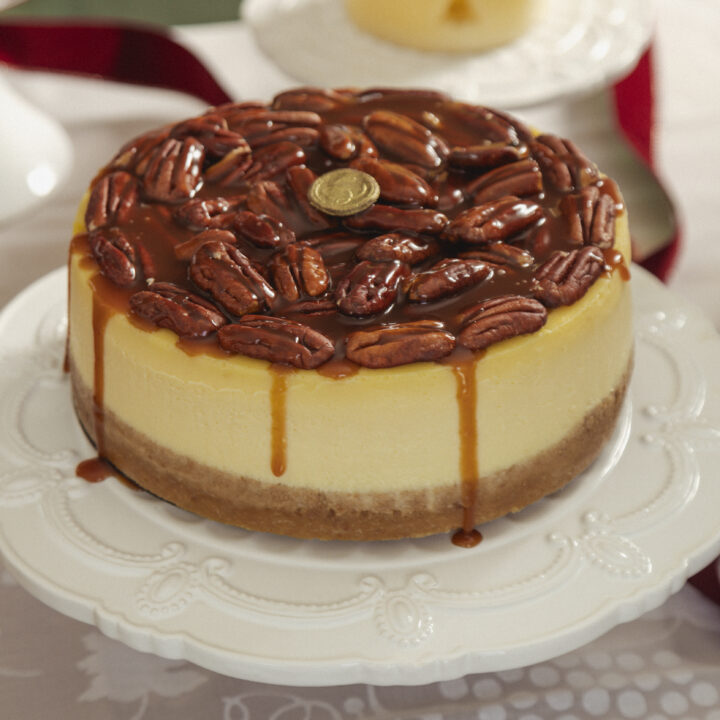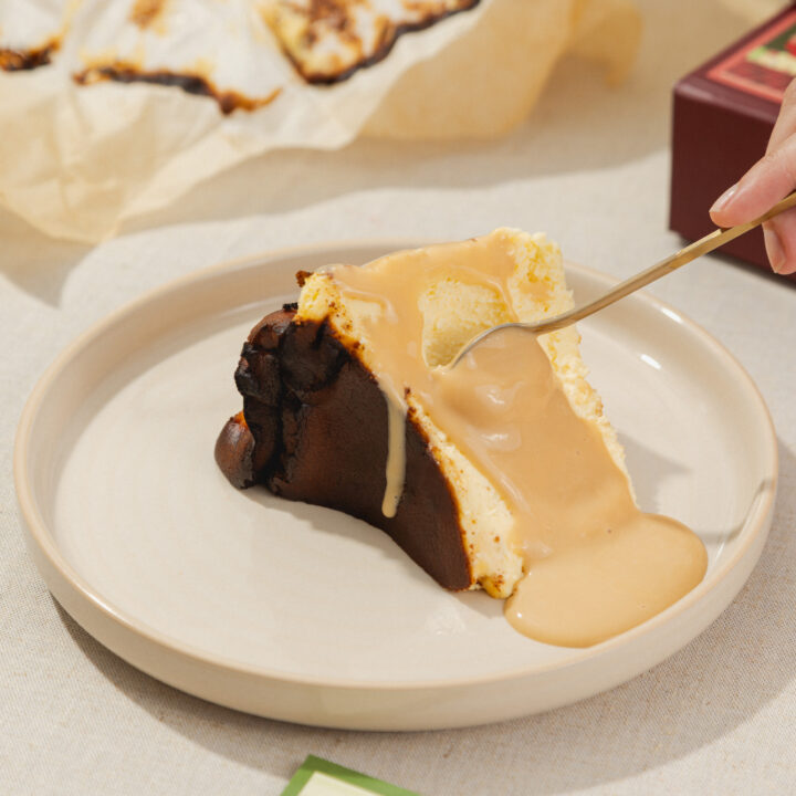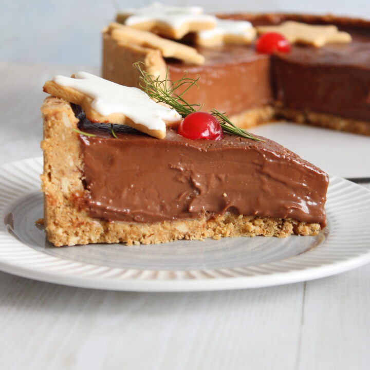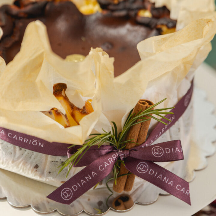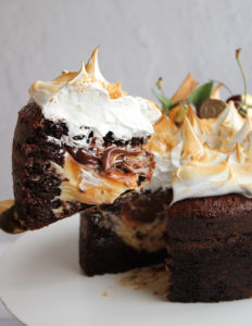 Cake húmedo de chocolate relleno con nuestro fudge de olla especial para Navidad y crema de Nido, cubierto con merengue flambeado, crumbs de galleta y cerezas.