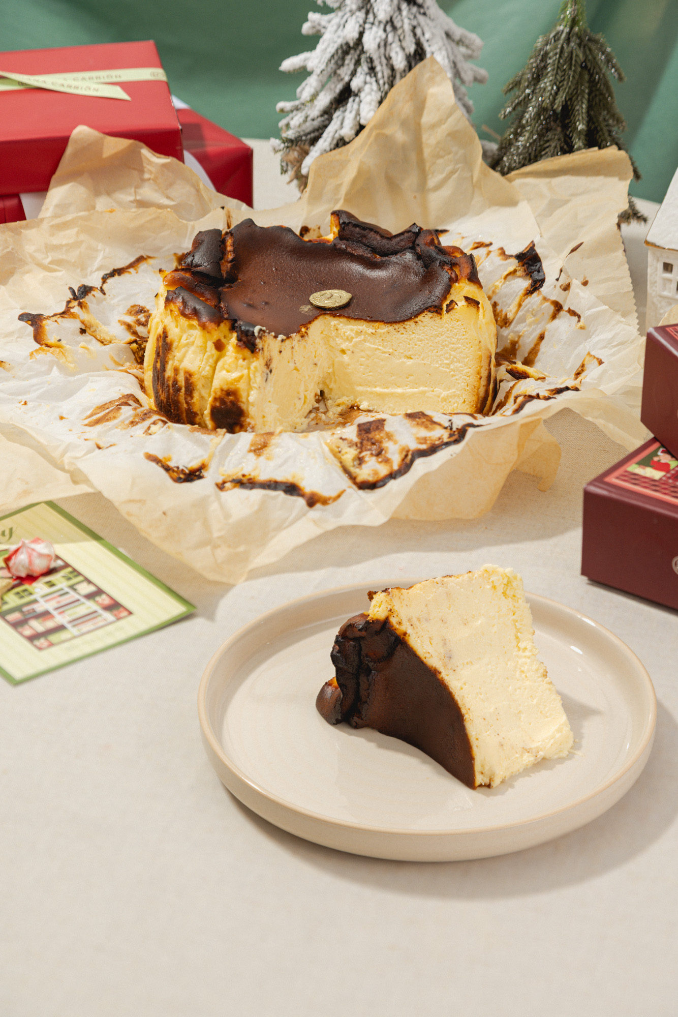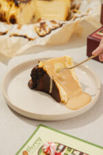 Clásico cheesecake al estilo vasco con sabor a rompope, acompañado de nuestra salsa de rompope hecha con una receta familiar que ha pasado de generación en generación por más de 30 años.