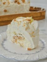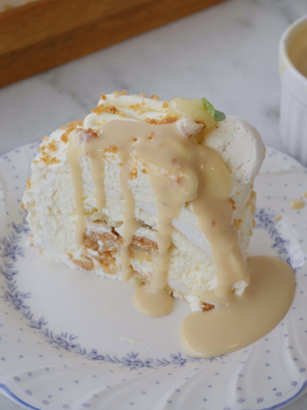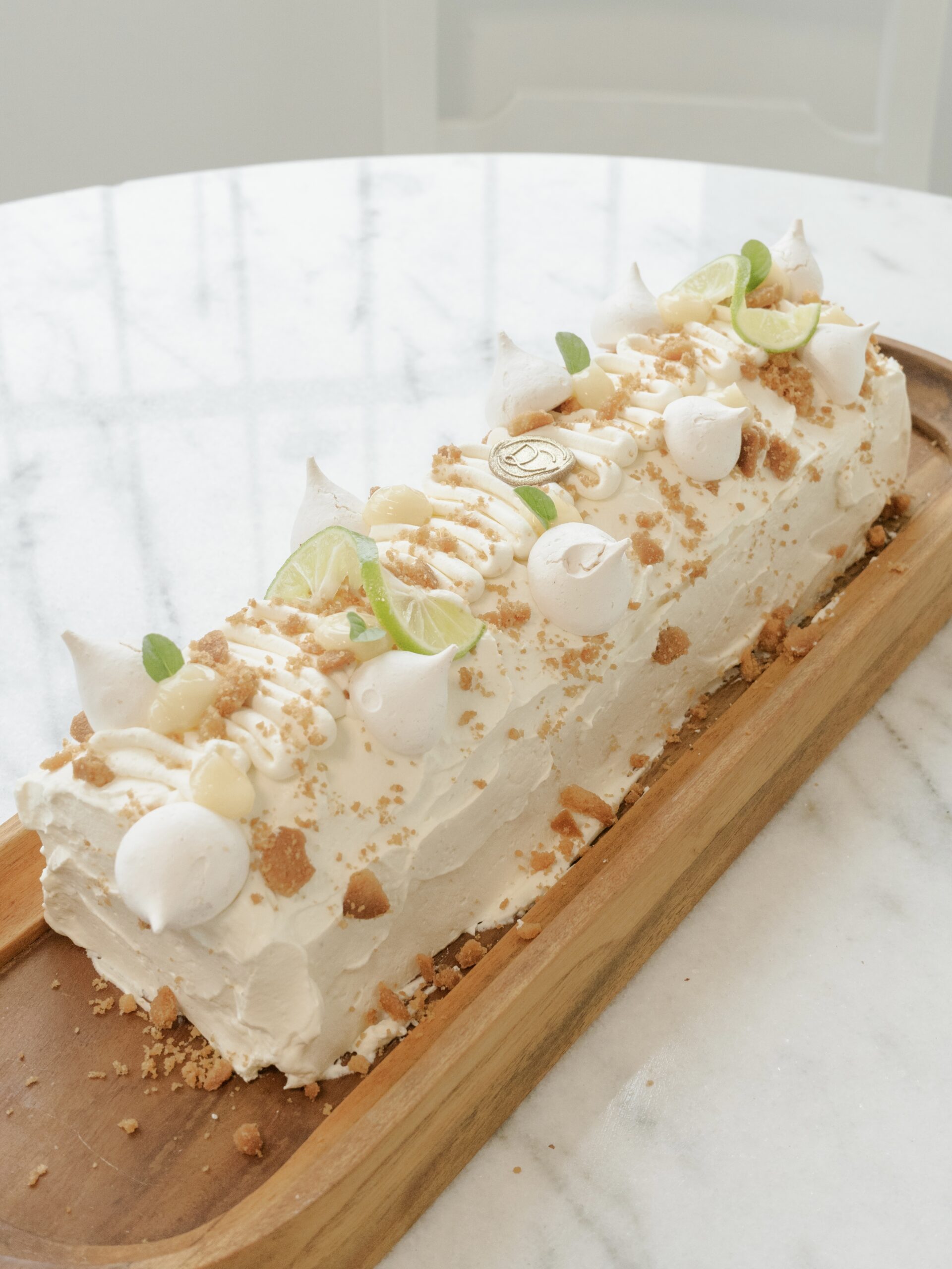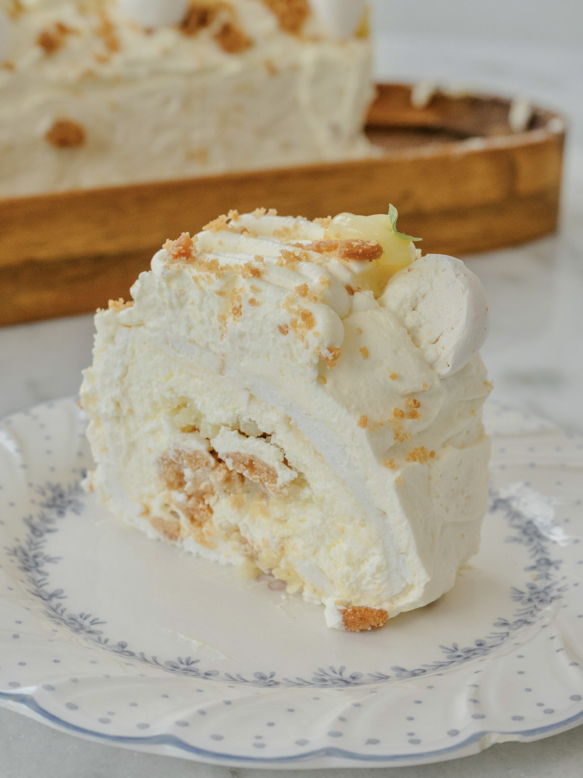 Nuestro enrollado a base de suspiro artesanal, relleno de una suave crema chantilly y nuestra salsa de limón especial.