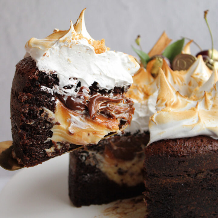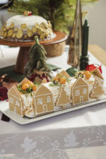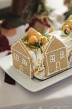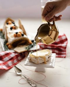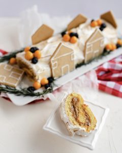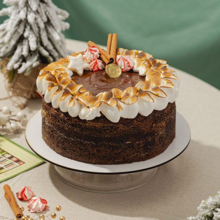 Nuestro clásico enrollado humedecido en Rompope, con relleno de manjar de olla, cubierto con merengue flambeado, decorado con casitas de jengibre, uvillas y ramitas de romero. Acompañado de sabayón de Rompope.