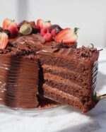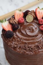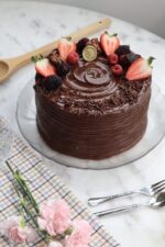 Grandma’s Fudge Cake: relleno con 3 capas de fudge de olla. Decorado con fudge, frutillas, moras y frambuesas.