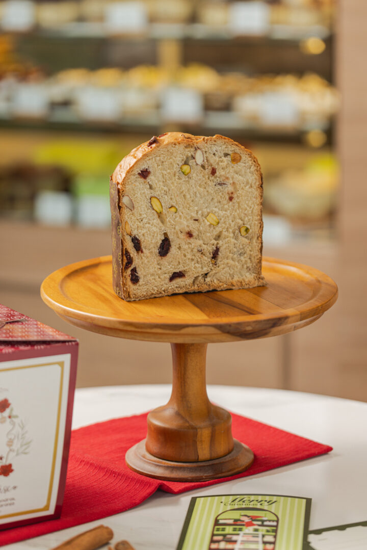 Pan de pascua con cranberries, almendras y pistachos. Viene en su caja de Postres Diana Carrión.