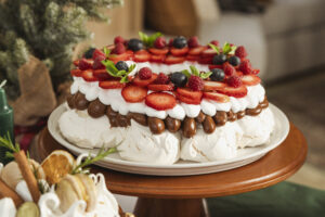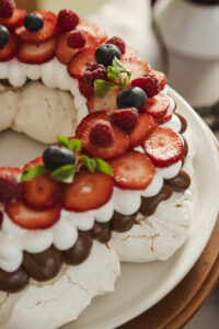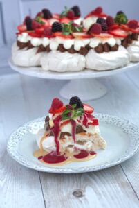 Suspiro amelcochado en forma de rosca, con manjar, crema y frutillas en lascas, decorado con frambuesas, moras y hojas de menta. Acompañado de salsa sabayón y frutos rojos.