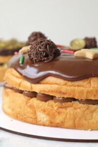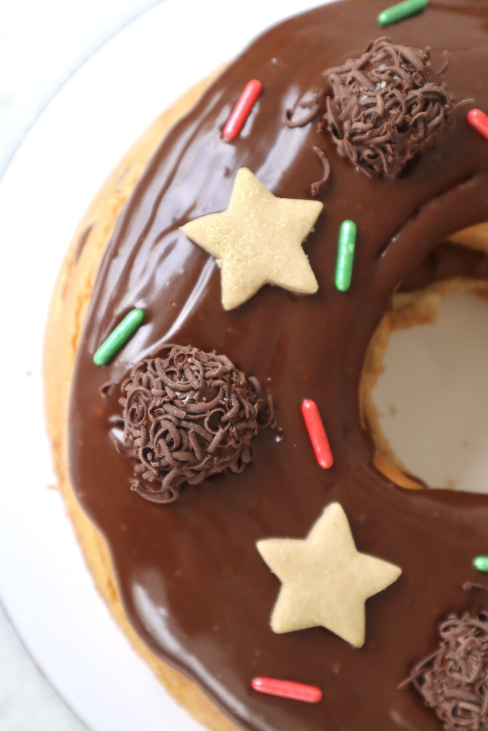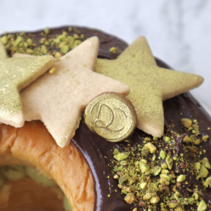 Un clásico de reyes con nuestro toque especial. Deliciosa rosca de pan con relleno de manjar, decorada con salsa de chocolate y sprinkles navideños. En caja de regalo especial de reyes.