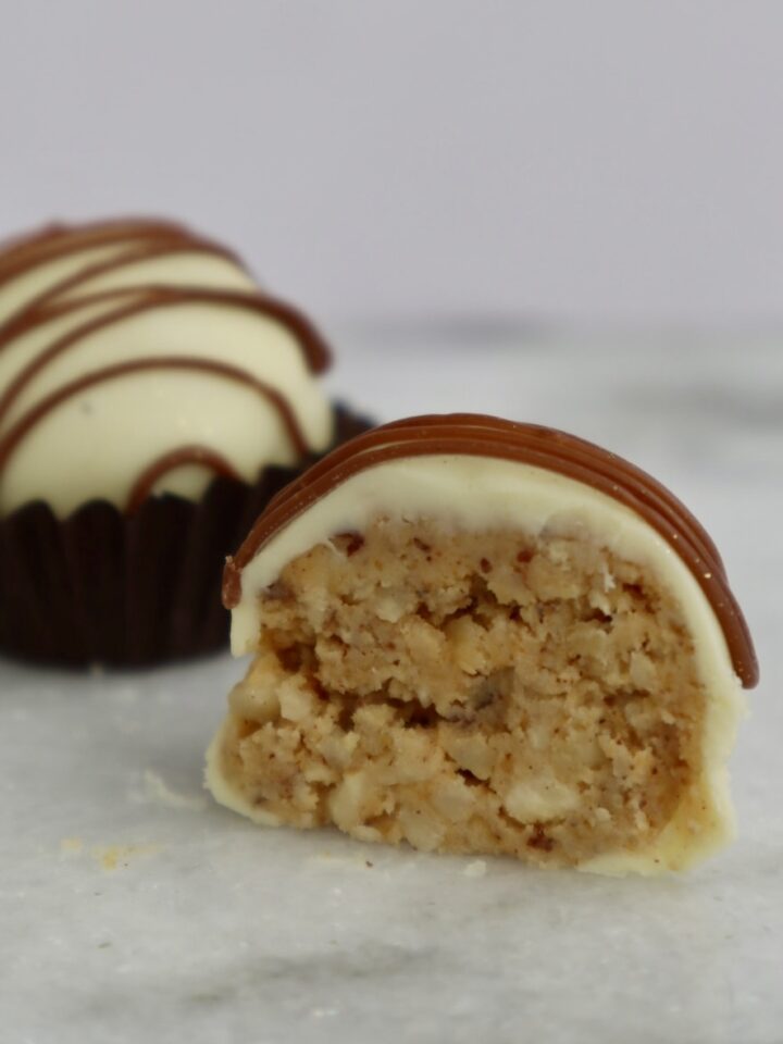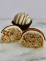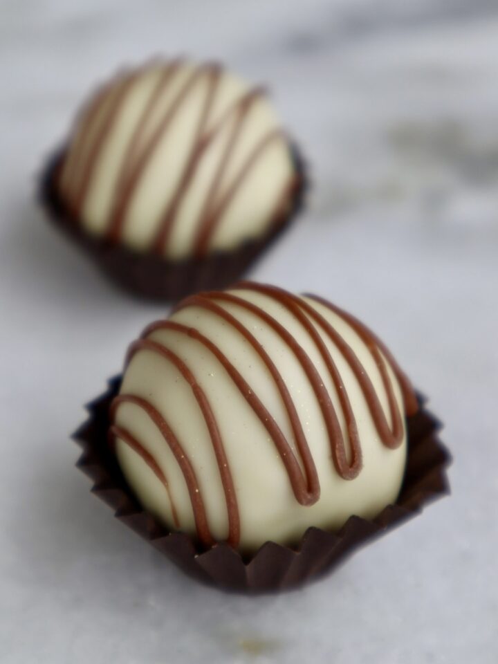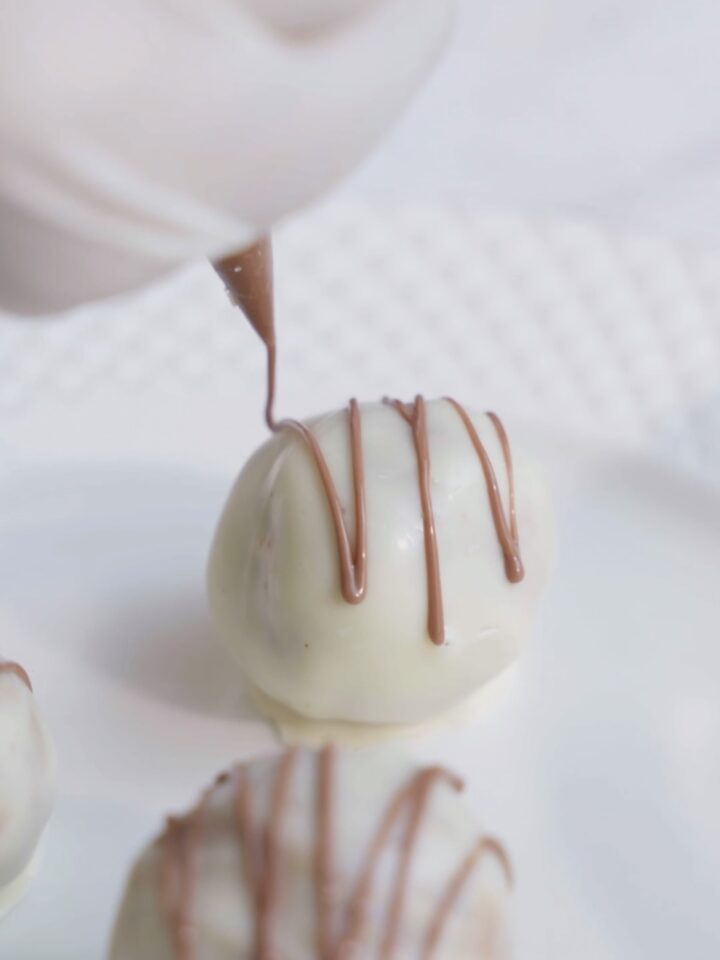 Nuestra receta secreta de crema de avellanas, cubierta con una capa de chocolate blanco 100% ecuatoriano y un toque de chocolate con leche para decorar. El balance perfecto entre suavidad, dulzura y crunch.